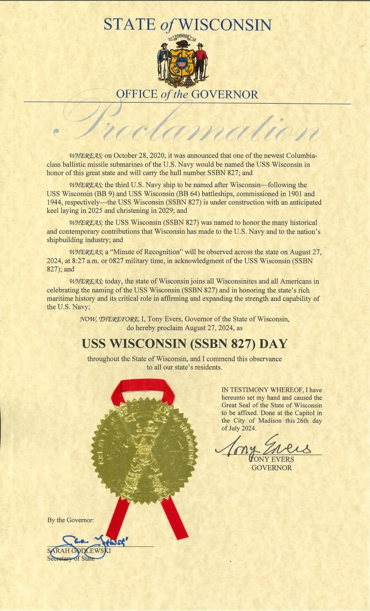 “NOW, THEREFORE, I, Tony Evers, Governor of the State of Wisconsin, do hereby proclaim August 27, 2024 as USS WISCONSIN (SSBN 827) DAY throughout the State of Wisconsin and I commend this observance across our state and to all our state’s residents, and request a “Minute of Recognition” on August 27, 2024, at 8:27 a.m., or 0827 military time, in acknowledgement.”